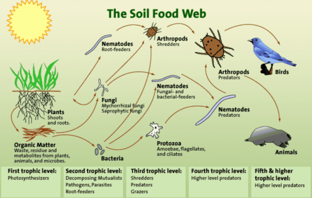 There are 2 primary approaches to this problem. One is to add NPK fertilizer and spray pesticides. The second is to fix the soil’s food web. To pursue the latter, we must realize that the nutrients the plants need exist in the soil’s organic matter. However, they do not have the enzymes to be able to assimilate them. That requires the predator-prey relationship, of a diverse group of organisms, that make the nutrients bioavailable. First, the bacteria and fungi break down the organic matter. Then, the protozoa, nematodes and anthropods eat the fungi and bacteria, thus making the nutrients available to the plants through their excrement.