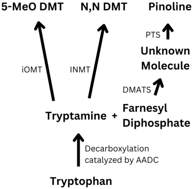 Here, heart expansion (through the e•motion of love) and nitric oxide, work together to ignite the alchemical wedding. The alchemical wedding occurs when our feminine lunar seed (pituitary gland) releases oxytocin and reciprocally decreases vasopressin. This causes our masculine solar seed (pineal gland) to increase melatonin production, that in turn, increases the expression of our enzymes of enlightenment; that of INMT and iOMT. These enzymes convert tryptamine to N,N DMT and 5-MeO DMT, respectively. Nitric oxide also activates the enzymes of DMATS and PTS, increasing their ability to convert tryptamine to pinoline.